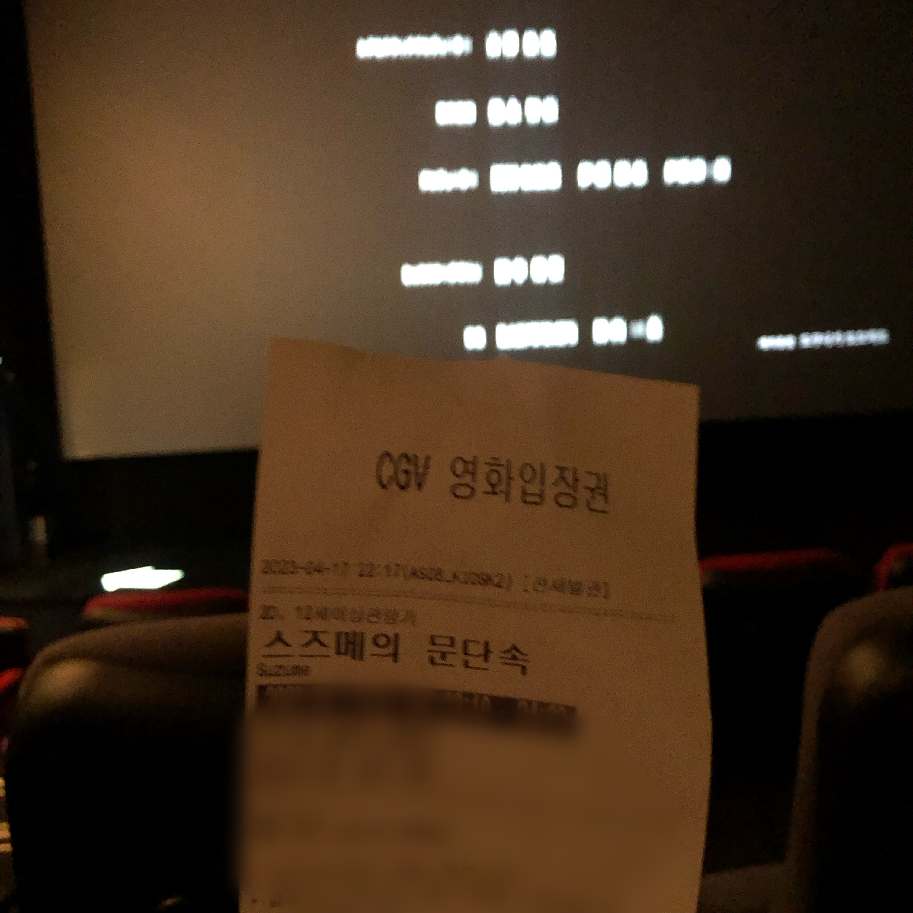 원래 이날은 학교 일정이 새벽 1시에 끝나는 거였는데 약간의 변동이 있어서 11시에 일찍 끝났습니다 그래서 친구랑 같이 뜬금 없는거 아는데 스즈메 볼래…? 가 되어서 10분만에 친구는 씽씽이, 저는 카카오 바이크 타고 근처 영화관으로 달려가 턱걸이로 오프닝까지 놓치지 않고 영화를 봤어요