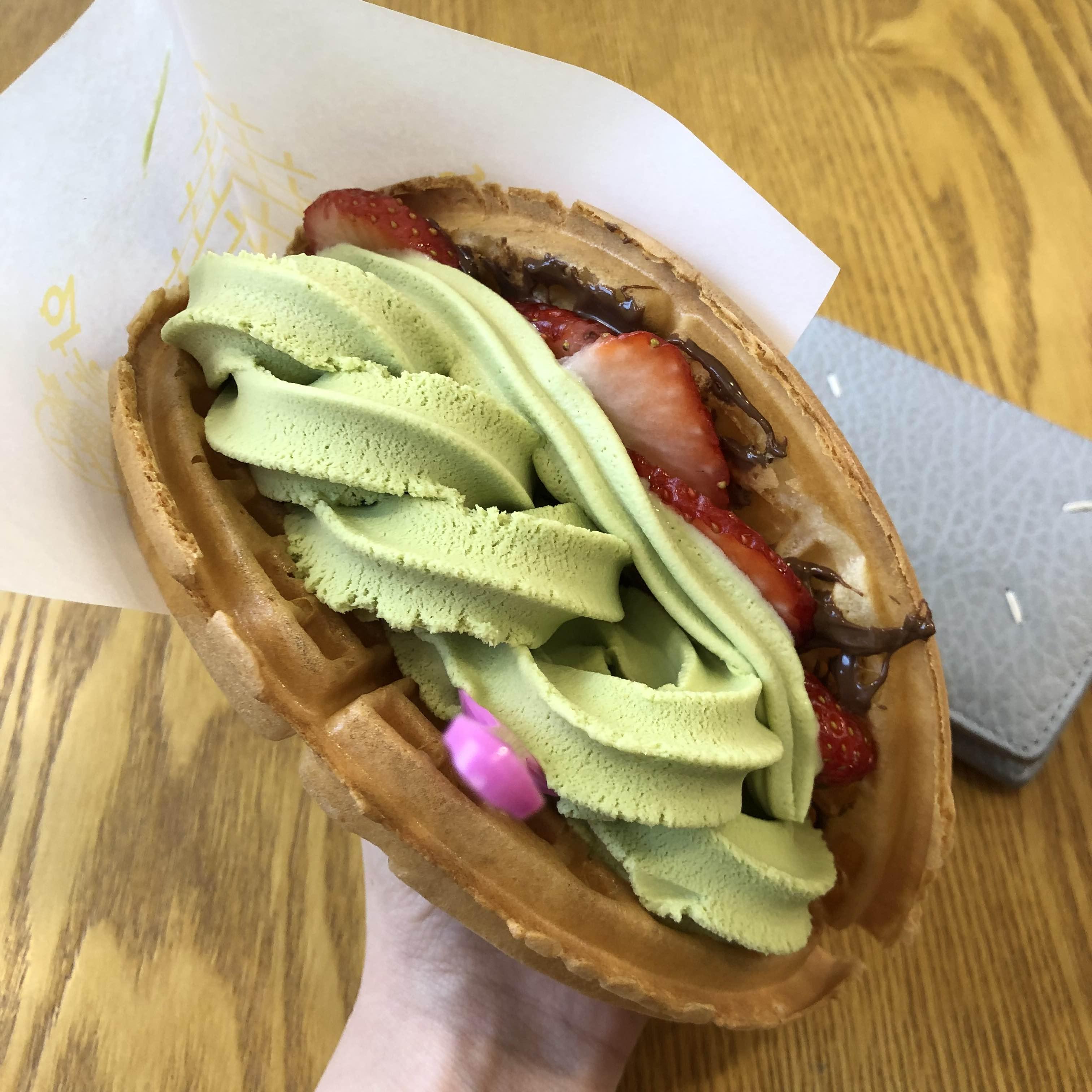 와플대학에서 파는 뭐더라 누텔라 딸기 아이스크림 와플? 말차를 젛아해서 아이스크림 말차로 바꿈